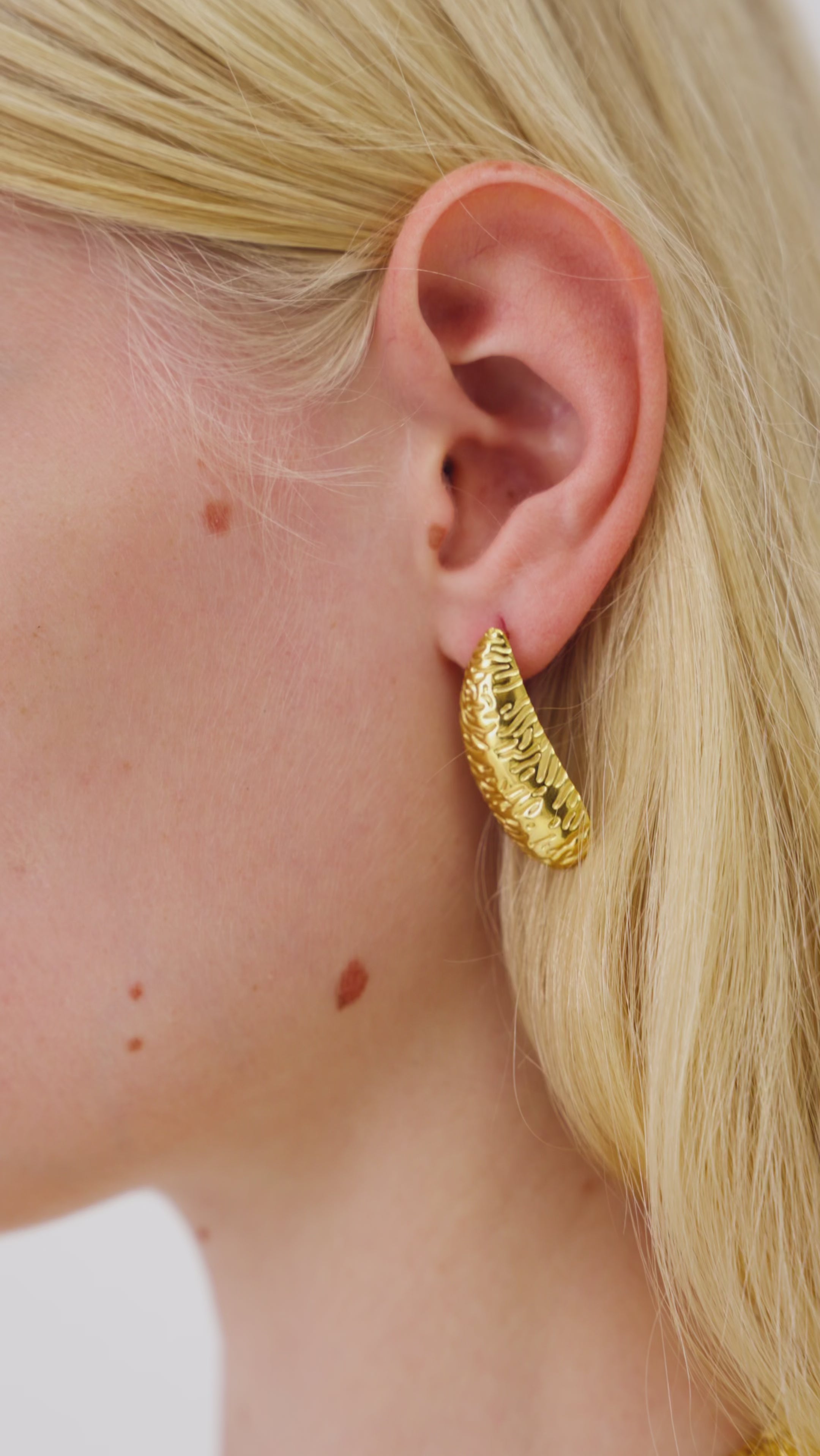 Sculptural and contemporary earrings characterized by a worked surface that elegantly captures the light. Their organic and harmonious shape makes them an ideal accessory to enhance refined and modern looks. Perfect for those who love jewelry with strong visual impact, these earrings add personality and style to both everyday outfits and more sophisticated ones. A jewel designed to stand out with class and originality.