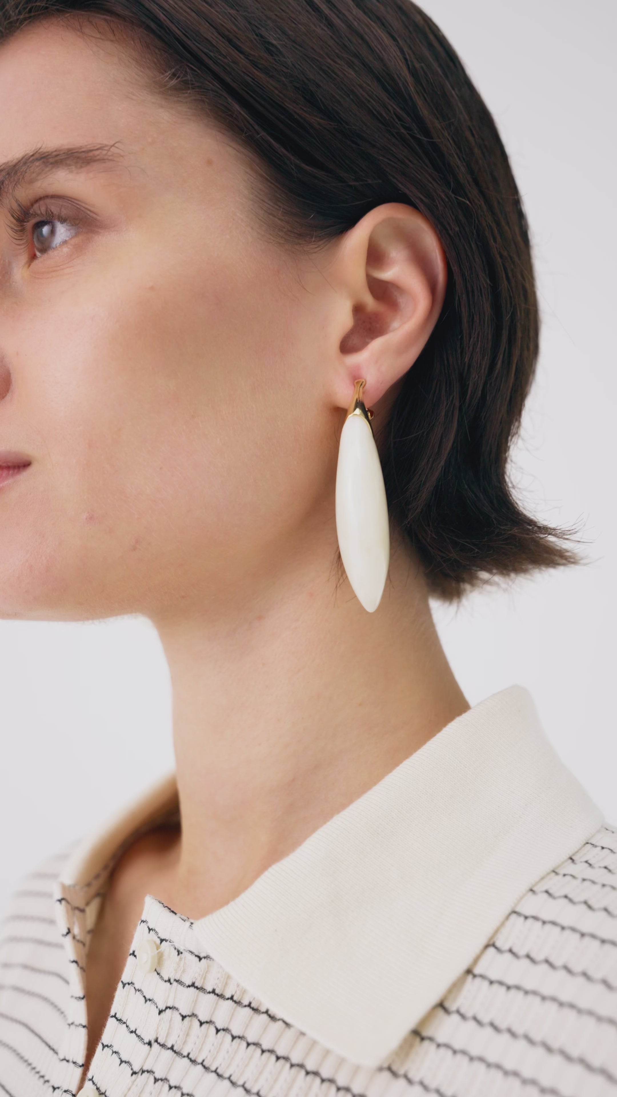Clip-on earrings with an elongated pendant and a minimalist design, crafted from a smooth resin element and a metal top detail. The slender profile helps enhance the face and lends instant elegance, ideal for evening looks, ceremonies, or special occasions. The clip closure is perfect even without piercing and offers good stability. A simple yet striking fashion accessory, designed for those who love contemporary costume jewelry and easy-to-match pieces.