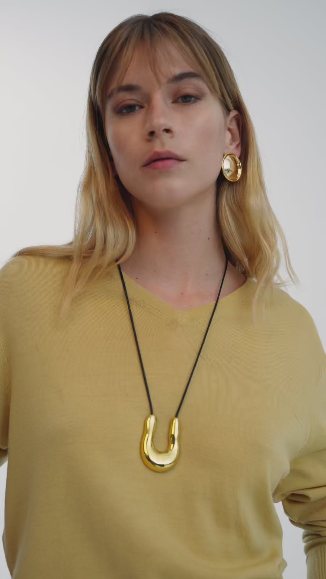 Long necklace with adjustable black cord and gold-tone U-shaped pendant, featuring a contemporary sculptural design.