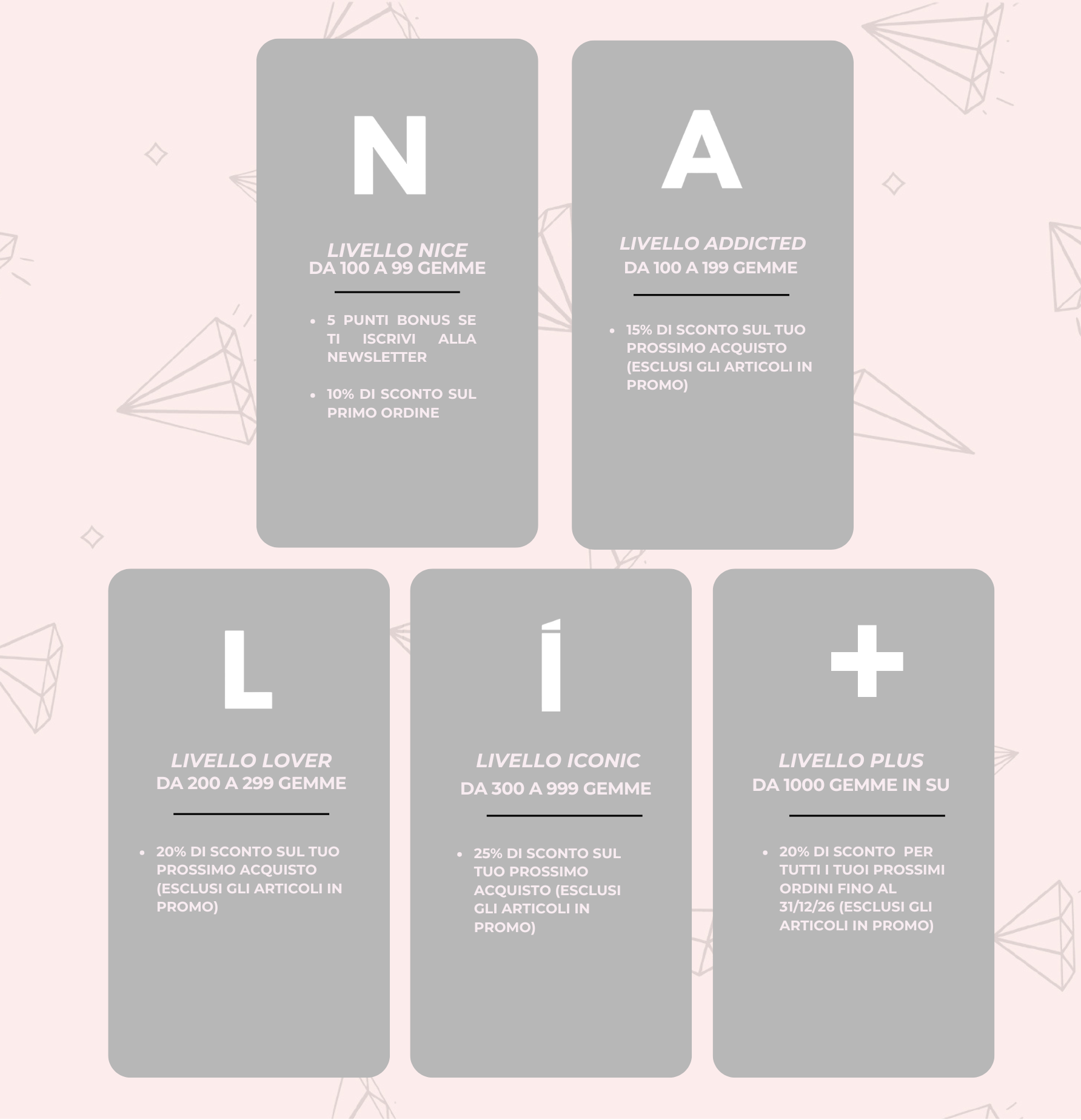 Iscrivendoti al Nalì Club, acquistando online e aggiornando le tue informazioni salirai di livello e potrai sbloccare ricompense super cool. È semplicissimo...