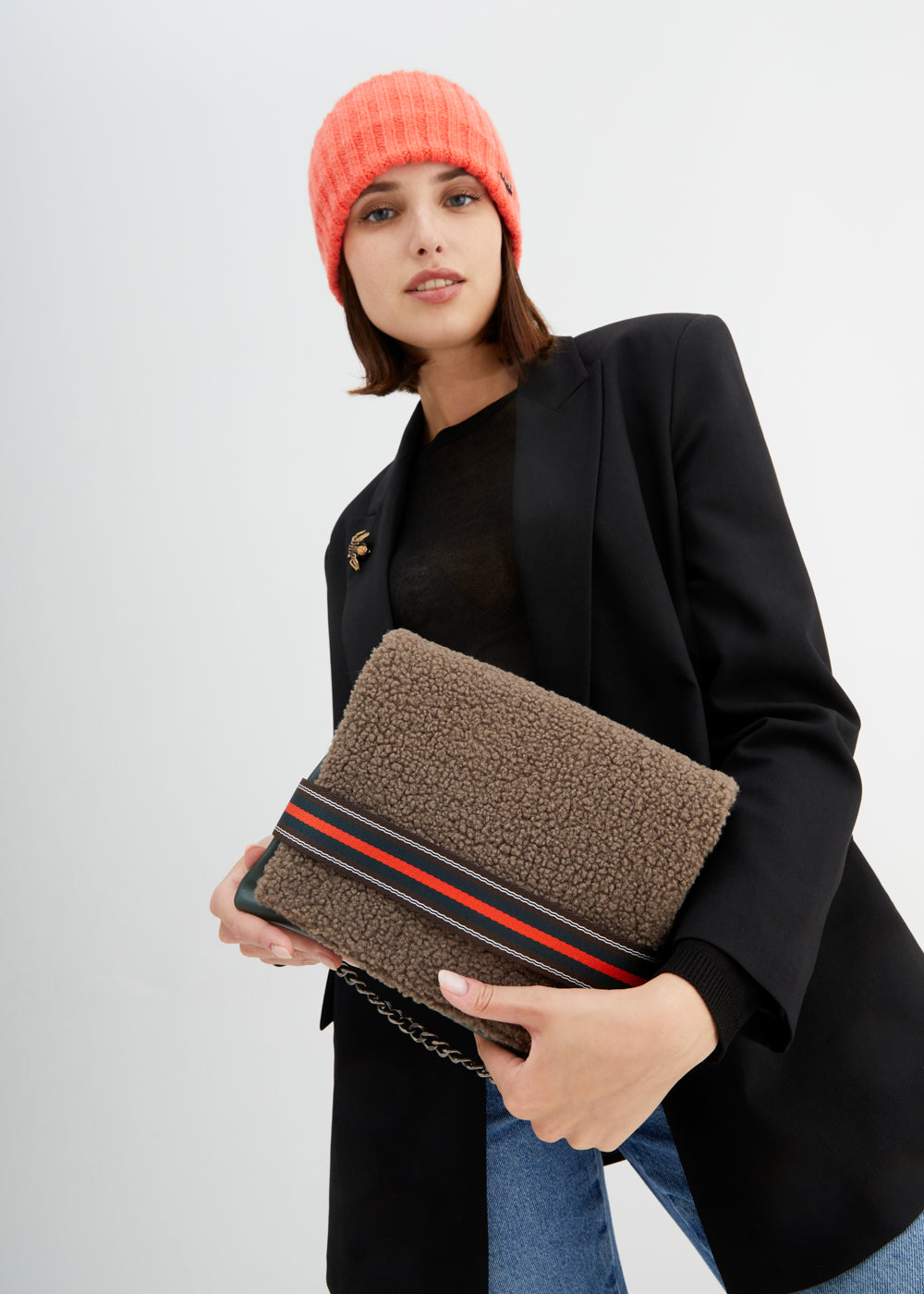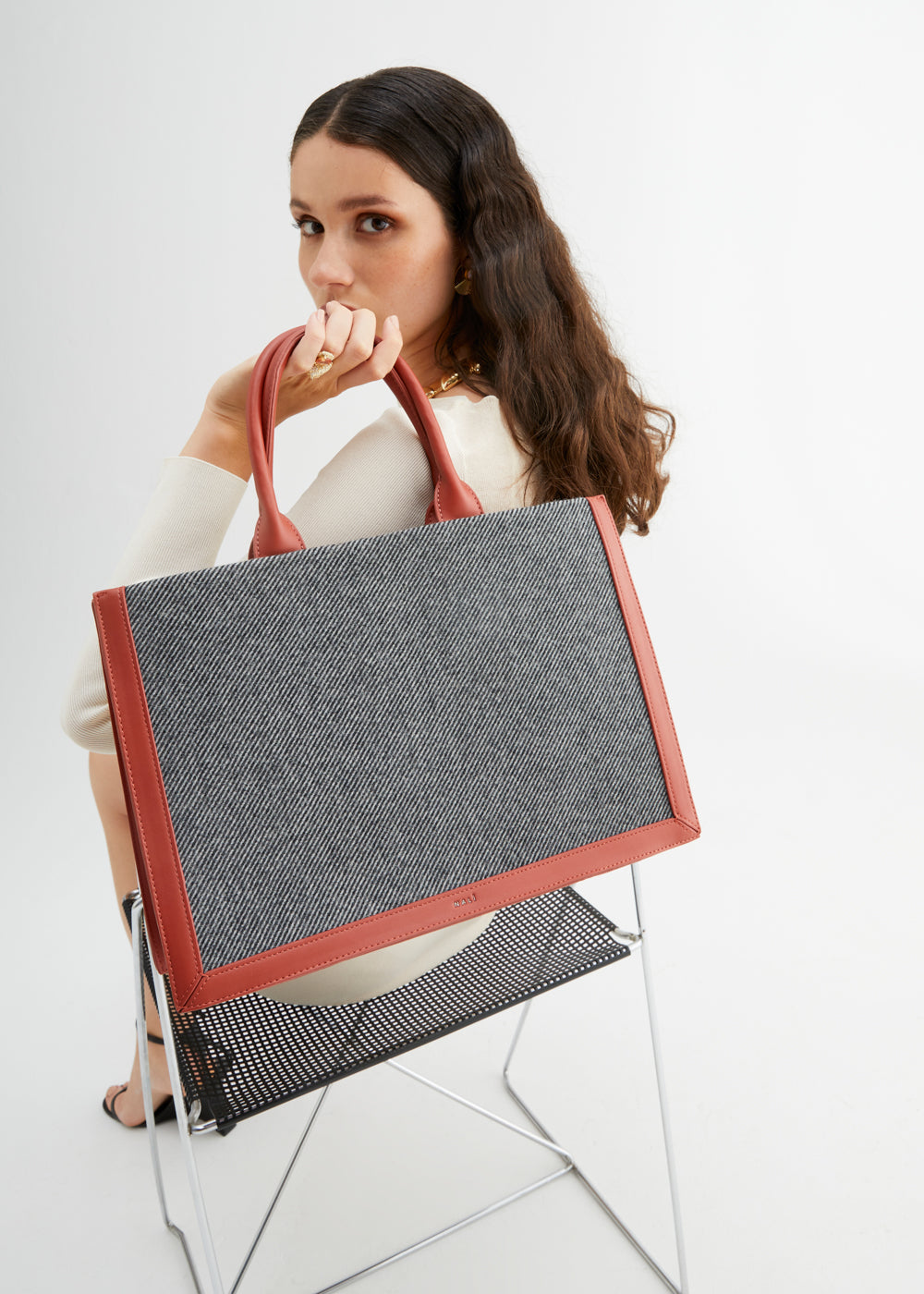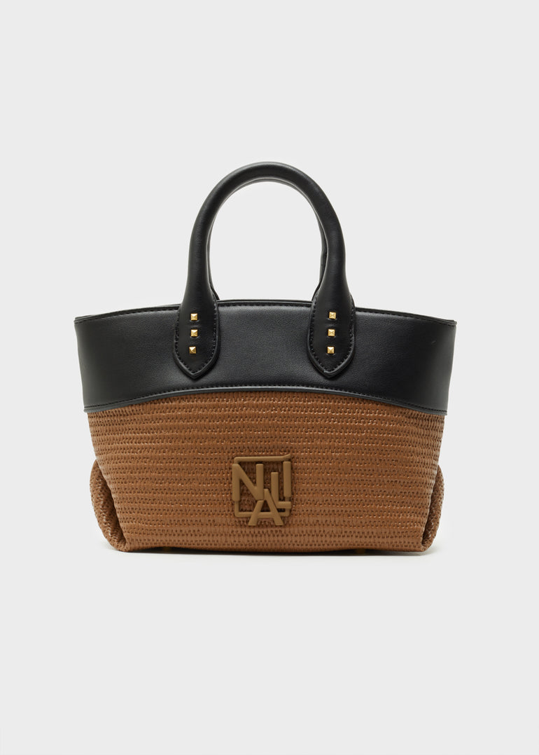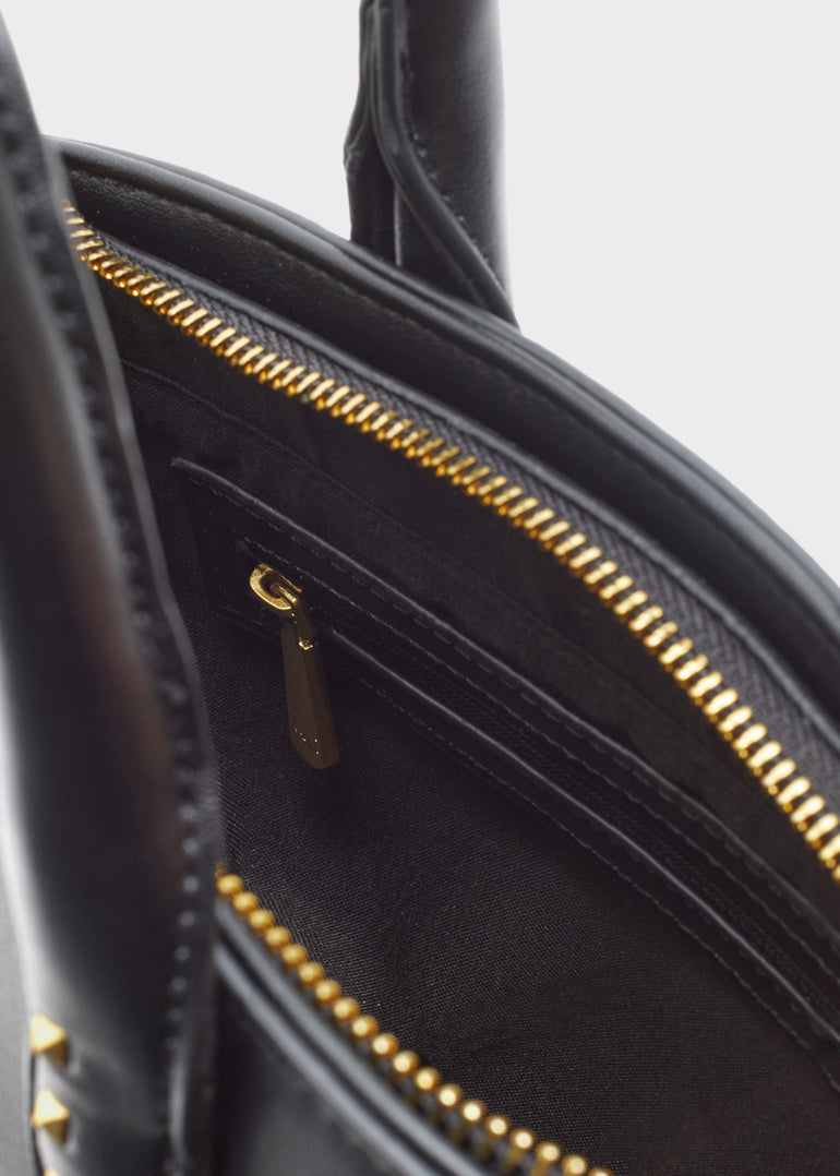 The mini Nalì bag to carry by hand in cherry and black color block is the cute choice for the aperitif. Designed with flaps turned up, front logo and studs on the handheld handles, it has a top zip closure and an extra shoulder strap.