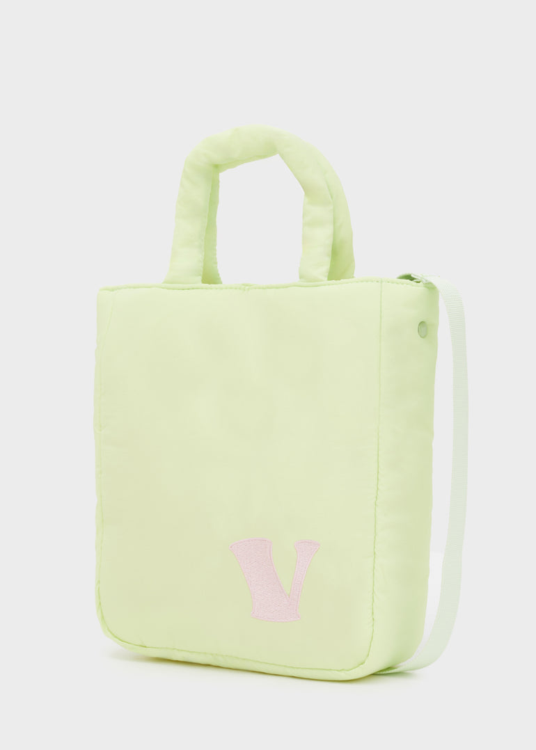 Casual and colourful handbag with letter detail. Equipped with magnetic closure and removable shoulder strap.