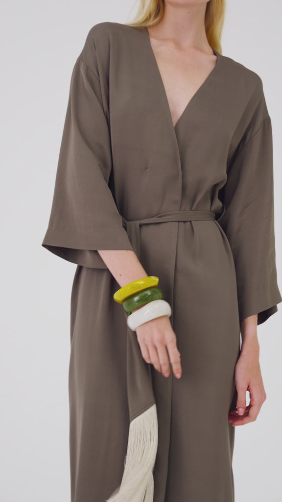 Cream-colored resin bangle with a modern, geometric design, embellished with a refined gold-tone metal bee detail. The warm, delicate hue makes this accessory extremely versatile and easy to match. The polished surface and compact structure lend an elegant, refined look, ideal for completing minimalist outfits or adding a touch of chic to more elaborate looks.