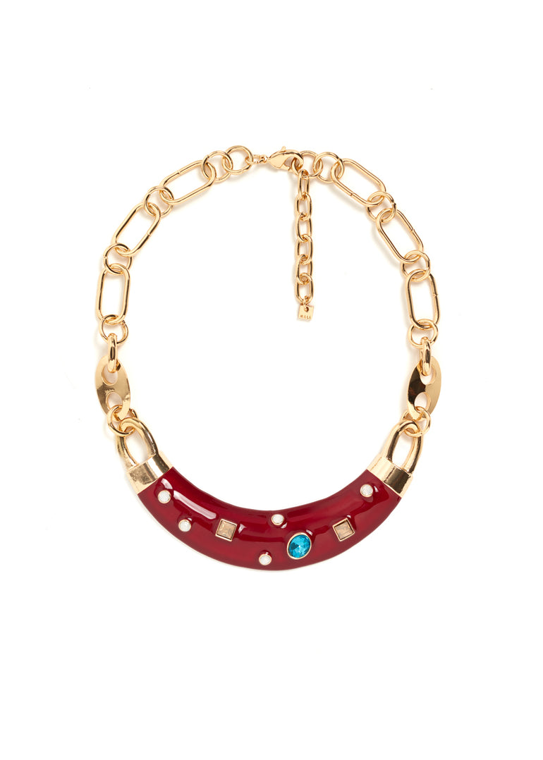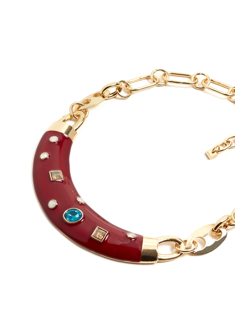 The Nalì short necklace with golden over chain design is enriched by a red enameled plaque with embedded crystals. Original and sparkling, it is equipped with a snap hook and adjustable closure.