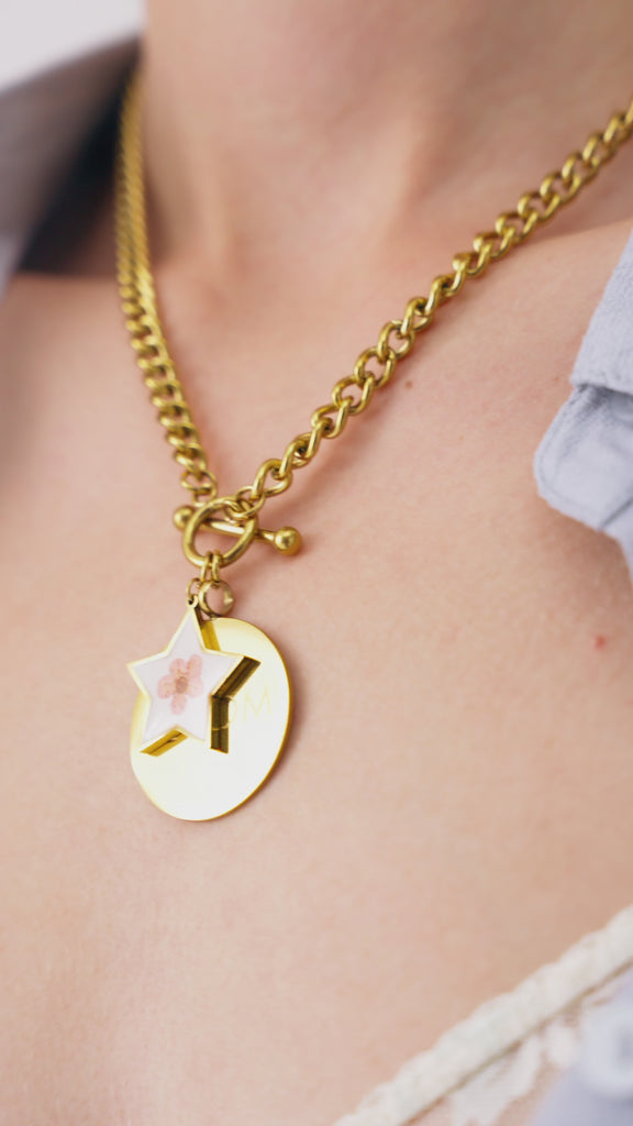 Necklace with a decorative front closure, designed to combine functionality and design in a single distinctive element. The movable pendant creates movement and adds dynamism, while the essential chain structure highlights the central detail. Ideal for those who love modern and sophisticated jewelry that enhances personal style with subtle elegance.