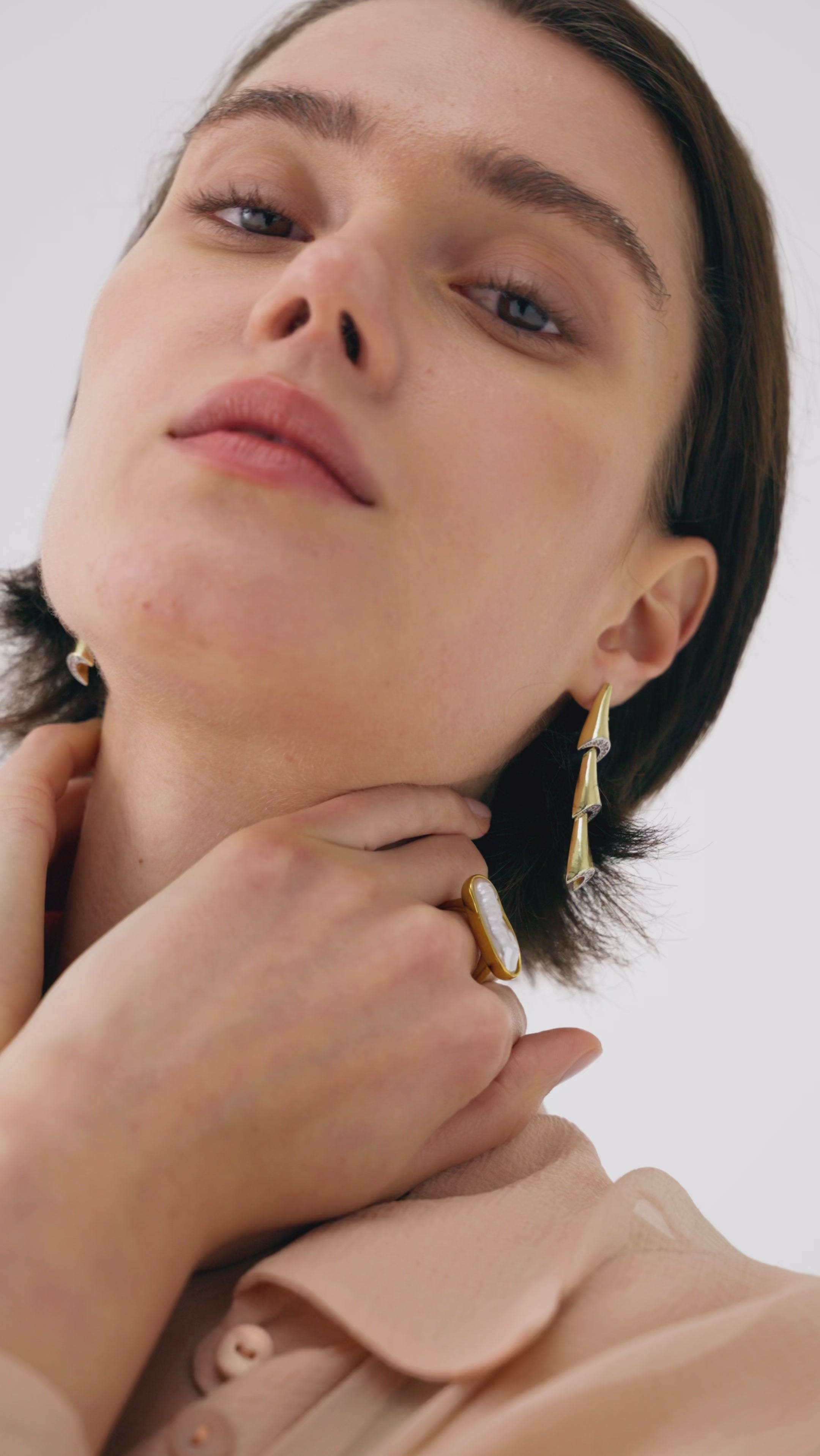 Drop earrings with a modular structure composed of curved elements arranged vertically. The interplay of shapes gives the piece movement and dynamism, creating an elegant and contemporary effect. Ideal for those who love sophisticated yet unconventional accessories that discreetly stand out.